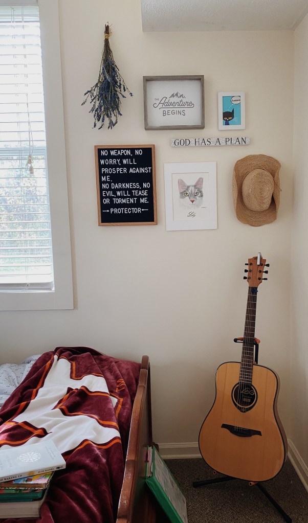 This corner of my room makes me look really cool and trendy- mostly because of my guitar which I pick up and play when I have time. My picture of Lily I had in my dorm of course is in this room too. The little blue cat in the frame on the top right was a screenshot from a book Anna and I read to the kid with special needs we watched over the summer. On my letter board are the lyrics from Protector by Kim Walker-Smith.