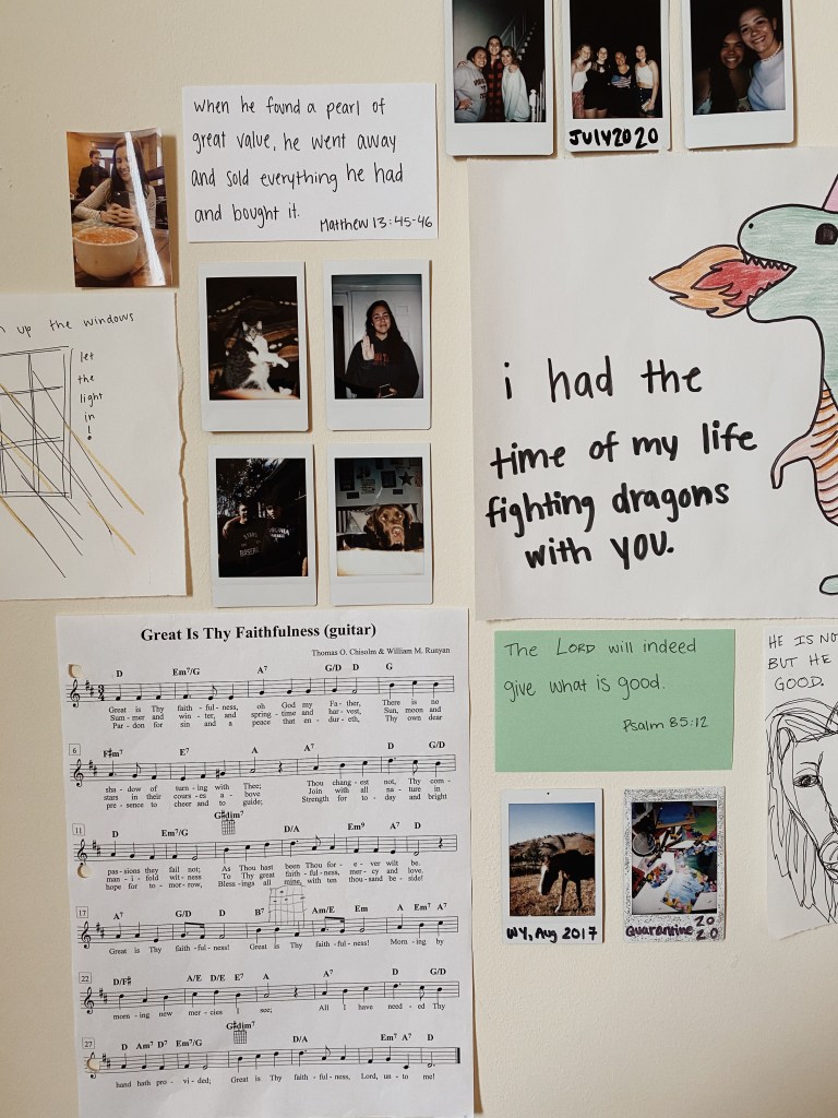 I started a collage wall recently so I could hang up things I draw and write and the polaroids I have.