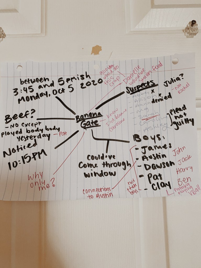 Banana Gate, also known as Banana Bandit, was a little prank that got pulled on me where someone taped banana peels to my bed. I STILL don’t know who did it after a month and yes I’ve interrogated my roommates and pretty much everyone else.