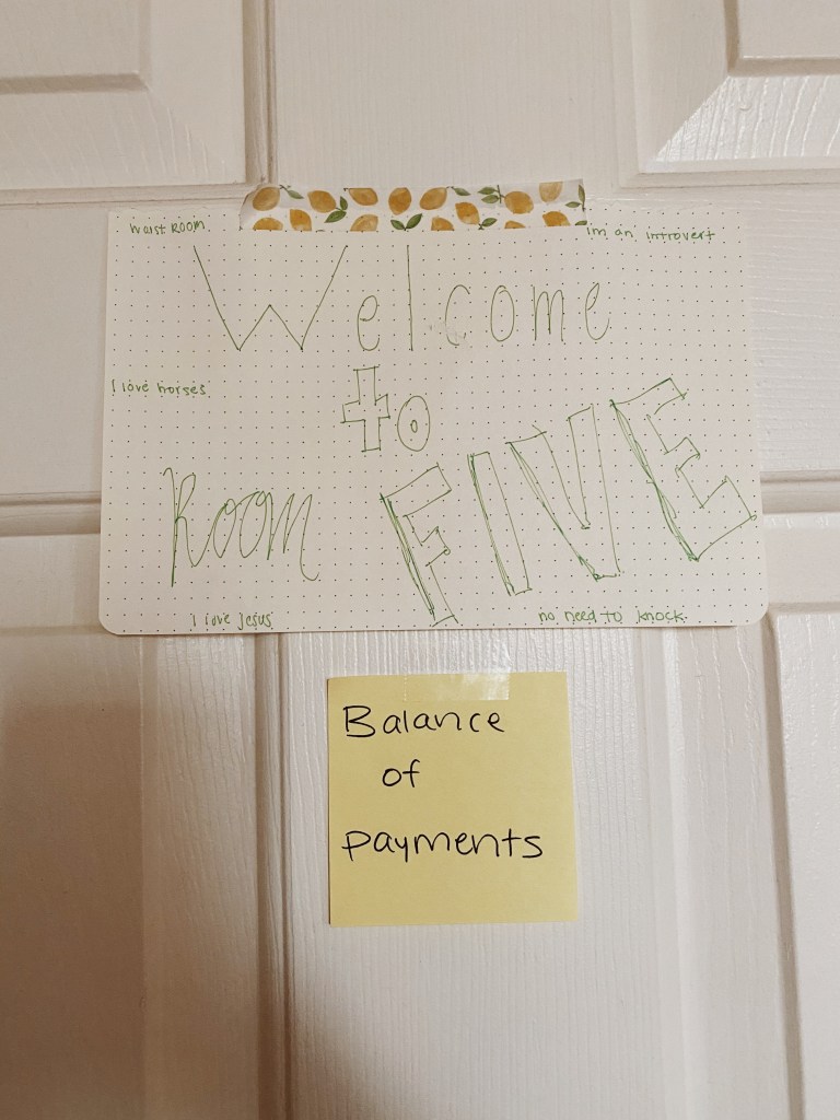 My roommates call my room Room 5 for no good reason (we don’t even have five rooms in our house) but they made me this sign. Our house is called the BOP which stands for Babes on Progress and also Balance of Payments in macro economics.