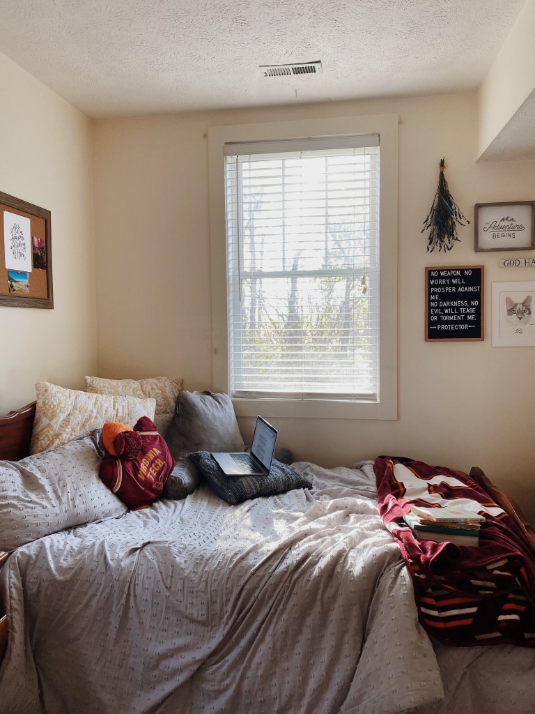 Fall is in full swing here in Blacksburg, and after a rocky start to the semester- getting Covid and adjusting to all online classes- we are settled in and enjoying college. I thought I’d post some pics that I think will mark this semester, starting with my room which I spend a good amount of time in.