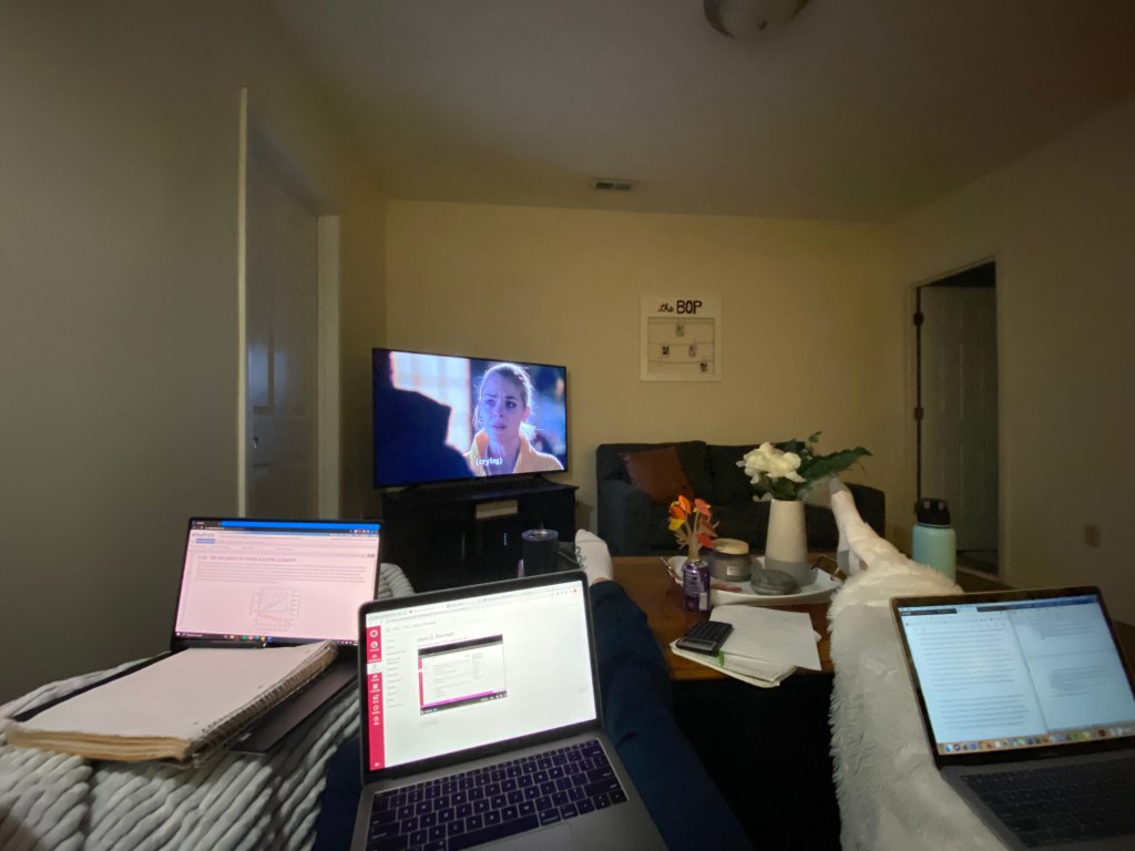 I tend to go to bed earlier than my roommates but sometimes I stay up and watch Hart of Dixie with them. Every once in a while we all do homework in the living room for a change of scenery.