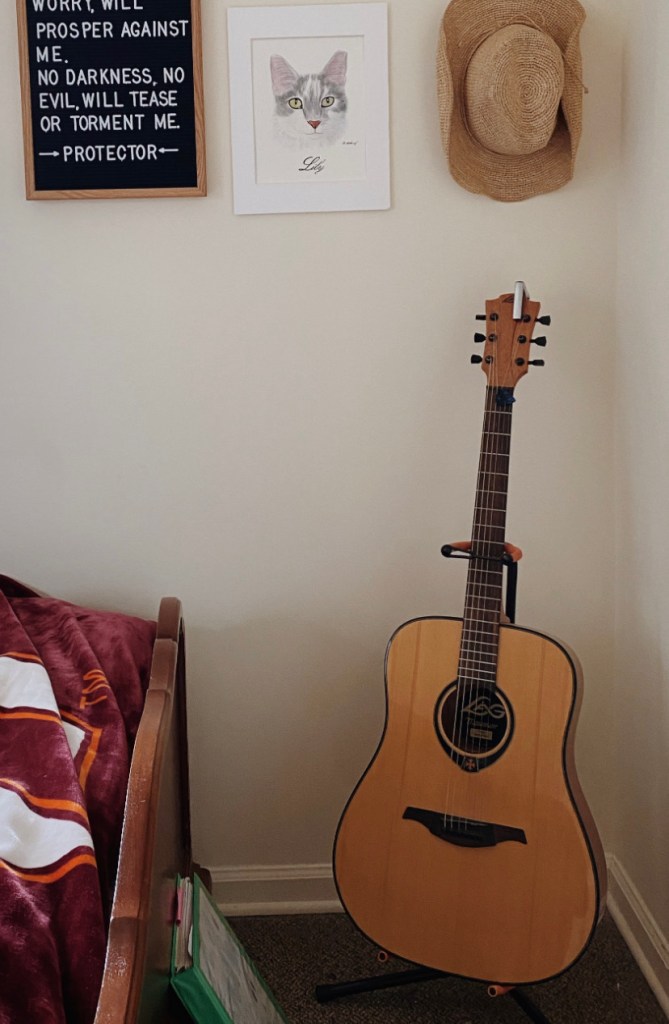 My precious little guitar. Some seasons I pick it up daily and others I don’t touch it for a month. Either way, it’s therapeutic to strum and play familiar songs I’ve played a thousand times or learn a new one. I’m thankful I started playing in middle school because it makes guitar a calming hobby rather than something I have to learn. I pretty much only play for myself, or with my friend Tracey once a year, and I’m happy with that.
