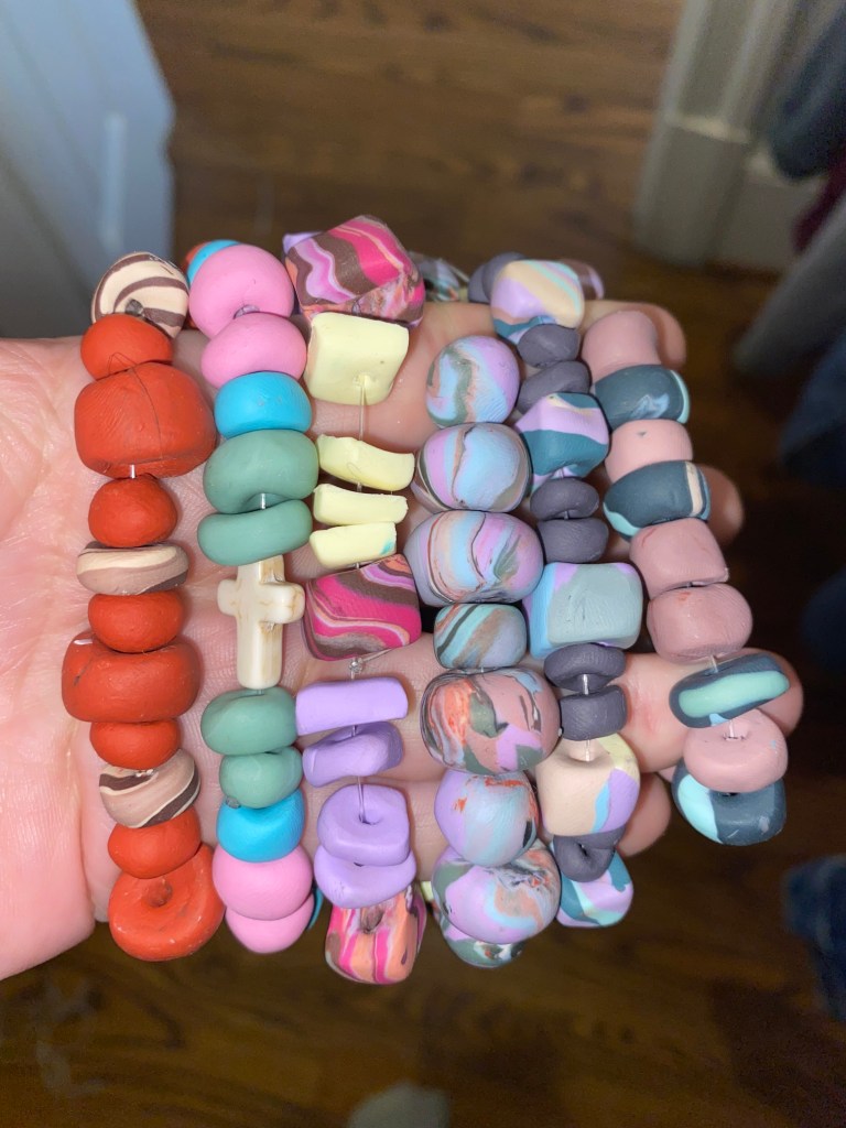 My summer fixation was making beads out of polymer clay (Fimo/Sculpey) and then making bracelets from those beads. To be honest, these bracelets are my least favorite of the ones I made because the rest are back in Blacksburg. That’s the great thing about hobbies though, you don’t have to do them well.