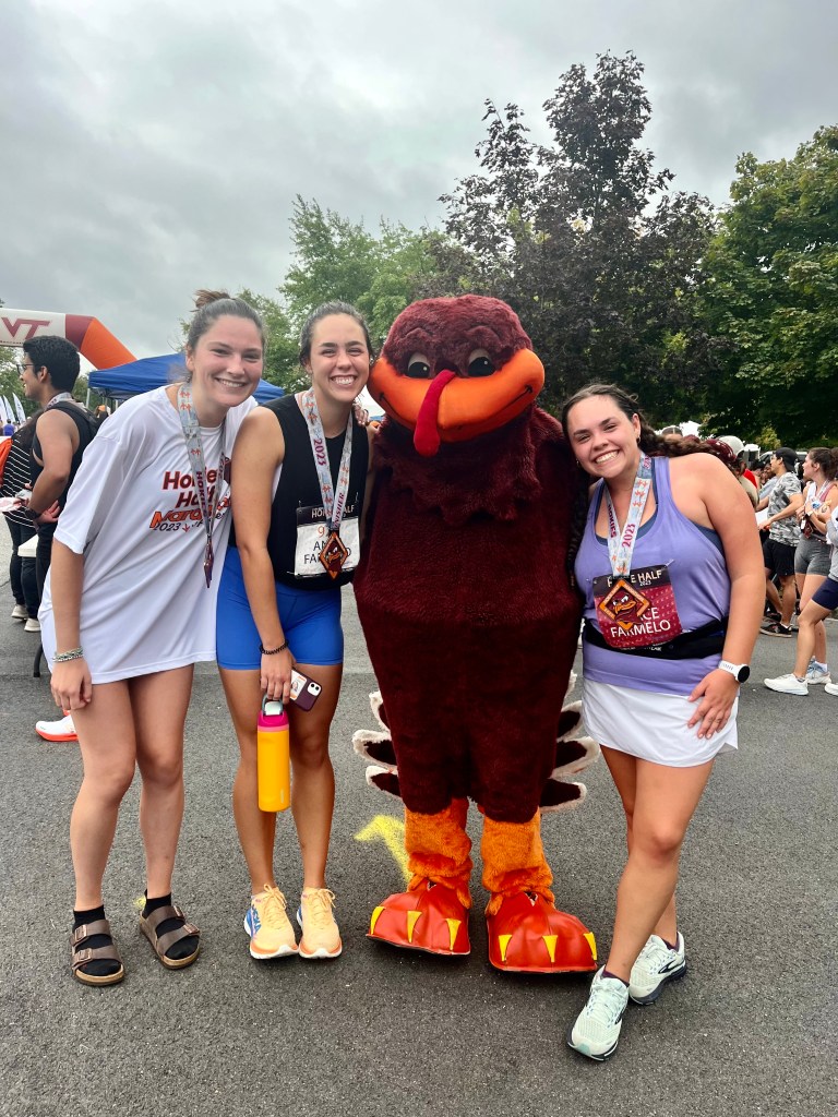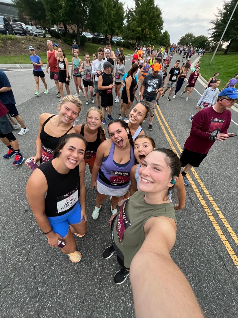 Race weekend was my first time back in Blacksburg since graduation. Fun to be back, but daunting to know the race was right around the corner. My sister and all her roommates were all running the Hokie-Half, so there was an “all in this together” mentality that made it fun. We ate pasta the night before, no one slept well, then got up before the sun to force ourselves to eat and get to the start, all while reminding ourselves we signed up for this for fun.