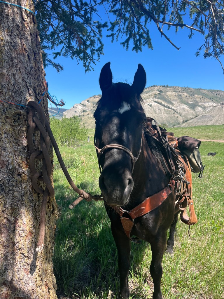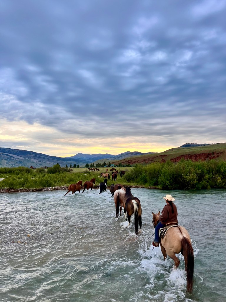 On a morning when it was my turn to wrangle, I would get up at 5:00am, make coffee, get dressed, read my Bible, and attempt to take a few sips of that coffee before heading outside to meet Brittany at her door. We’d walk to the barn, tack up the two horses we left in, and hop on to ride out and get the rest of the herd. This is the actual wrangling part of being a wrangler. It would usually take some hollering and whistling, but the herd would start turning and lope toward the barn.